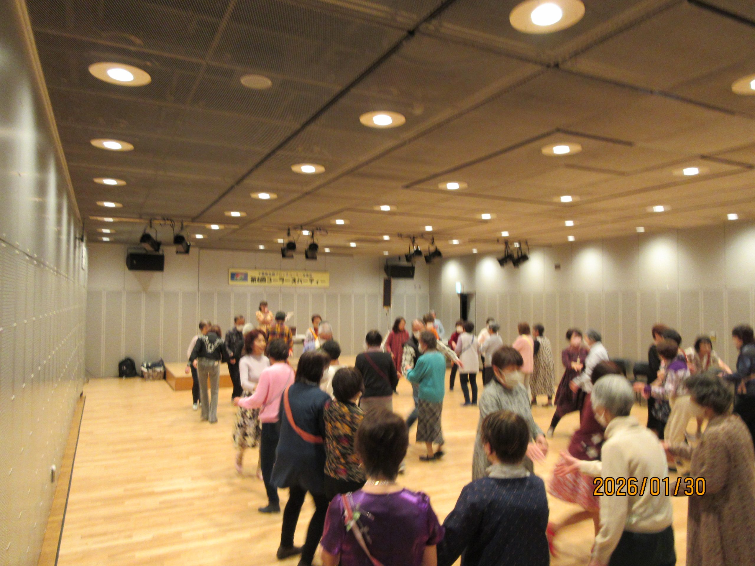 当日はコーラー13名、ダンサー45名の計58名の参加でした。本パーティーはコーラーの技術発表会が趣旨で、ダンサーは無料です。コーラーの人前でのコール経験積みとサイトコールの実践の場としています。